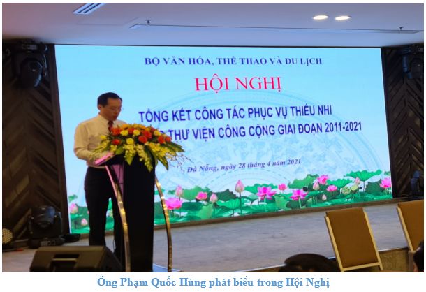 Ngày 28/4/2021, tại thành phố Đà Nẵng, Bộ Văn hóa Thể thao và Du lịch tổ chức Hội nghị Tổng kết công tác phục vụ thiếu nhi trong các thư viện công cộng giai đoạn 2011 -2021, nhằm đánh giá thực trạng và hiệu quả công tác phục vụ thiếu nhi trong các thư viện công cộng giai đoạn 2011 – 2021, đồng thời xác định phương hướng, mục tiêu, giải pháp trong thời gian tới nhằm thúc đẩy, đổi mới và nâng cao hiệu quả công tác phục vụ thiếu nhi tại các thư viện công cộng trong thời kỳ mới.