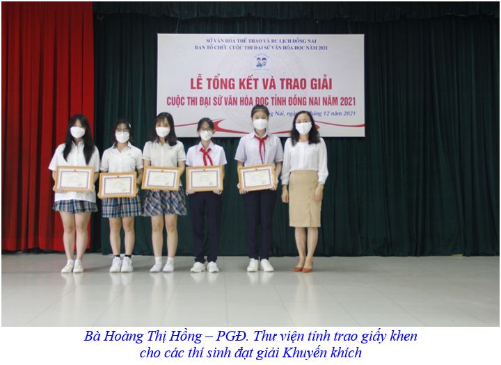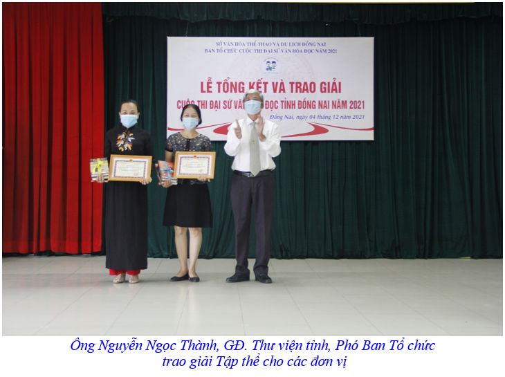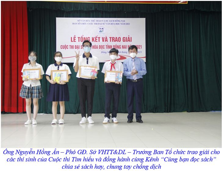 Dịp này, BTC cuộc thi cũng đã trao 2 giải Ba, 9 giải Khuyến khích và 01 giải chuyên đề cho 12 thí sinh đạt giải của tỉnh Đồng Nai tại Cuộc thi “Tìm hiểu và đồng hành cùng Kênh Cùng bạn đọc sách chia sẻ sách hay, chung tay chống dịch” do Dự án Sách và Hành động phối hợp với Trung tâm Phát triển Văn hóa đọc và Học tập suốt đời tổ chức nhằm thiết thực chào mừng kỷ niệm lần thứ 76 Cách mạng tháng Tám và Quốc khánh 2 tháng 9, trong bối cảnh cả nước đang đẩy mạnh công tác phòng chống dịch Covid-19, cuộc thi tổ chức nhằm lan tỏa niềm đam mê đọc sách và các giá trị của sách đối với học sinh, sinh viên, từ đó nâng cao khả năng, thói quen tự học, tự đọc, biết chia sẻ với bạn bè, góp phần phát triển văn hóa đọc trong nhà trường và cộng đồng.