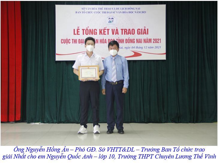 Tại buổi lễ, BTC đã trao 20 giải cho 19 bài thi có kết quả cao nhất trong cuộc thi Đại sứ văn hóa đọc tỉnh Đồng Nai năm 2021. Trong đó, giải Nhất thuộc về thí sinh Nguyễn Quốc Anh, Trường THPT Chuyên Lương Thế Vinh (TP. Biên Hòa); 2 giải Nhì thuộc về các thí sinh: Nguyễn Yến Nhi và Nguyễn Ngọc Minh Châu, Trường THPT Lê Qúy Đôn - Long Bình Tân...