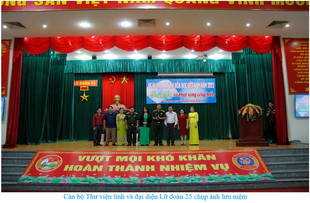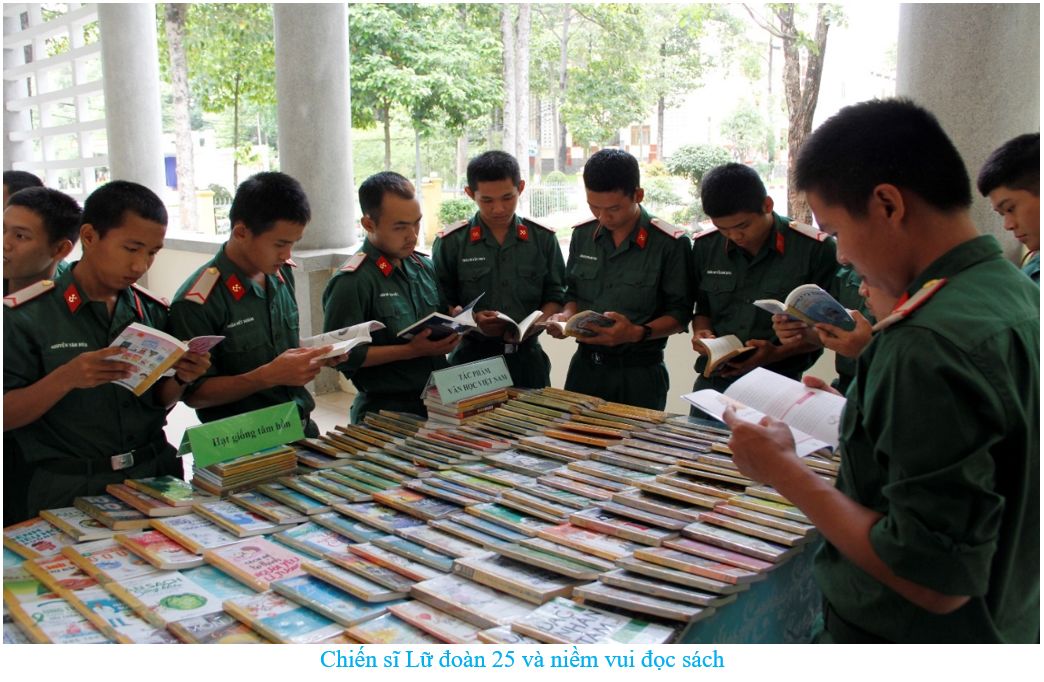 Ngoài ra còn có chuyên đề “Khi người lính đọc sách”, ghi lại hình ảnh những người lính trẻ ở Lữ đoàn Công binh 25 (Quân khu 7) với nét mặt rạng ngời khi đến với ngày hội sách. Họ, những người lính trẻ không chỉ vui với niềm vui được cầm trên tay những quyển sách mình yêu thích, được tham quan các mô hình xếp sách nghệ thuật ấn tượng, mà còn được nghe cán bộ Thư viện giới thiệu sách chuyên đề. Từ những hoạt động trưng bày, giới thiệu sách tại Lữ đoàn Công binh 25 và các đơn vị bộ đội trong tỉnh, đã góp phần thúc đẩy phong trào đọc sách, nâng cao nhận thức của cán bộ, chiến sĩ về ý nghĩa to lớn và tầm quan trọng của việc đọc sách. Tạo không khí thi đua sôi nổi, thiết thực chào mừng kỷ niệm 47 năm Ngày giải phóng Miền Nam, thống nhất đất nước (30/4); 68 năm Ngày chiến thắng Điện Biên Phủ (07/5) và 132 năm Ngày sinh Chủ tịch Hồ Chí Minh (19/5)…