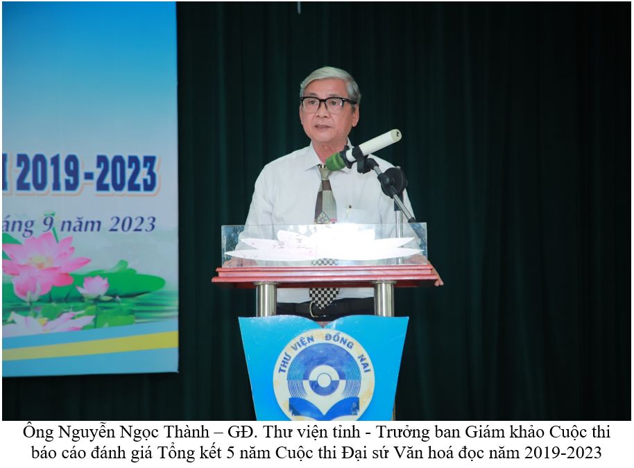 Trong buổi lễ, các đại biểu và các em thí sinh cũng được nghe Ông Nguyễn Ngọc Thành - Giám đốc Thư viện tỉnh - Trưởng ban Giám khảo Cuộc thi báo cáo Tổng kết 05 năm thực hiện Cuộc thi “Đại sứ văn hóa đọc” trên địa bàn tỉnh Đồng Nai (năm 2019-2023).