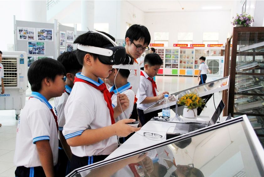 Học sinh sử dụng kính VR để tham quan triển lãm ảo 3D tại Thư viện tỉnh