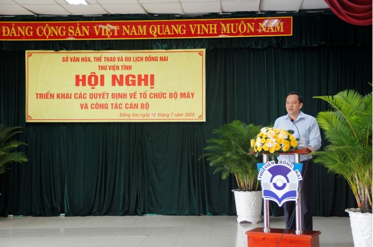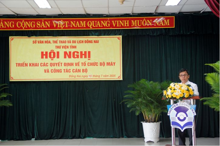 Chiều ngày 15/7/2025, Thư viện tỉnh Đồng Nai đã trang trọng tổ chức Hội nghị triển khai các Quyết định về tổ chức bộ máy và công tác cán bộ. Đây là sự kiện có ý nghĩa quan trọng nhằm công bố các Quyết định của UBND tỉnh và Sở Văn hóa, Thể thao và Du lịch (VHTTDL) về việc thành lập Thư viện tỉnh và kiện toàn đội ngũ lãnh đạo, quản lý trong giai đoạn mới.