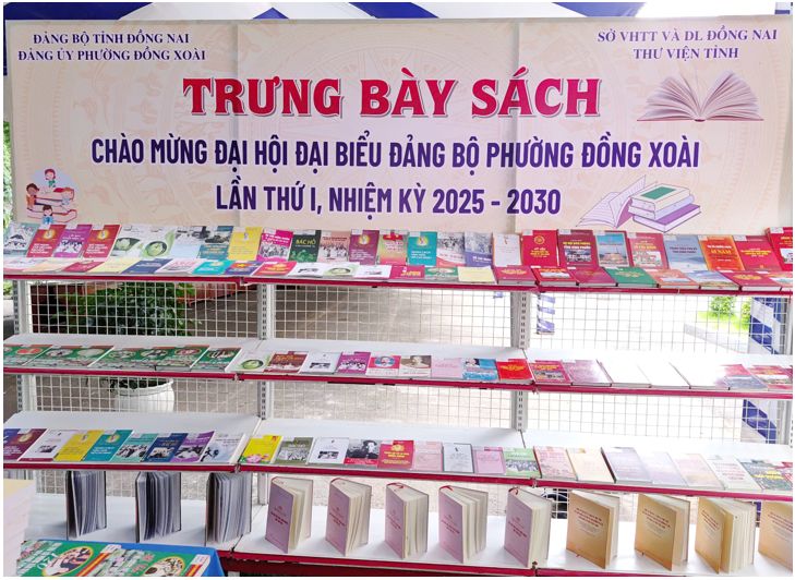 Chào mừng Đại hội Đảng bộ các cấp, tiến tới Đại hội Đại biểu toàn quốc lần thứ XIV của Đảng, từ ngày 11 đến 12/8/2025, tại khuôn viên Hội đồng Nhân dân tỉnh Bình Phước (cũ), Thư viện tỉnh Đồng Nai (Cơ sở 2) phối hợp với Đảng bộ phường Đồng Xoài tổ chức trưng bày sách chào mừng Đại hội Đại biểu Đảng bộ phường Đồng Xoài lần thứ I, nhiệm kỳ 2025 –2030.