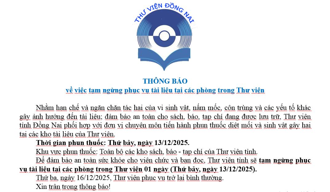 Thông báo về việc tạm ngưng phục vụ bạn đọc tại Thư viện tỉnh Đồng Nai, phường Tân Triều