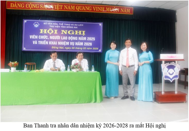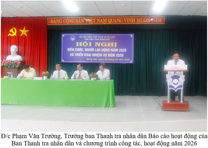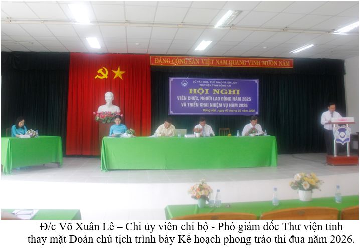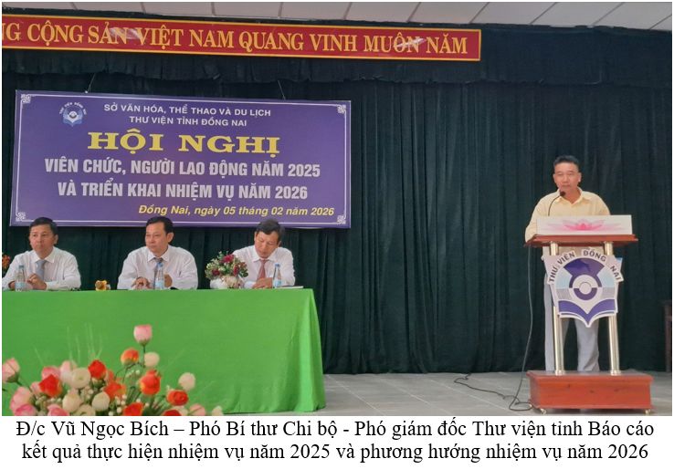 Ngày 05/02/2026, Thư viện tỉnh Đồng Nai tổ chức Hội nghị viên chức, người lao động năm 2025. Tham dự Hội nghị có Ban Chấp hành Chi bộ, Ban Giám đốc Thư viện tỉnh; các đồng chí Trưởng, Phó các phòng chức năng cùng toàn thể viên chức và người lao động Thư viện tỉnh.