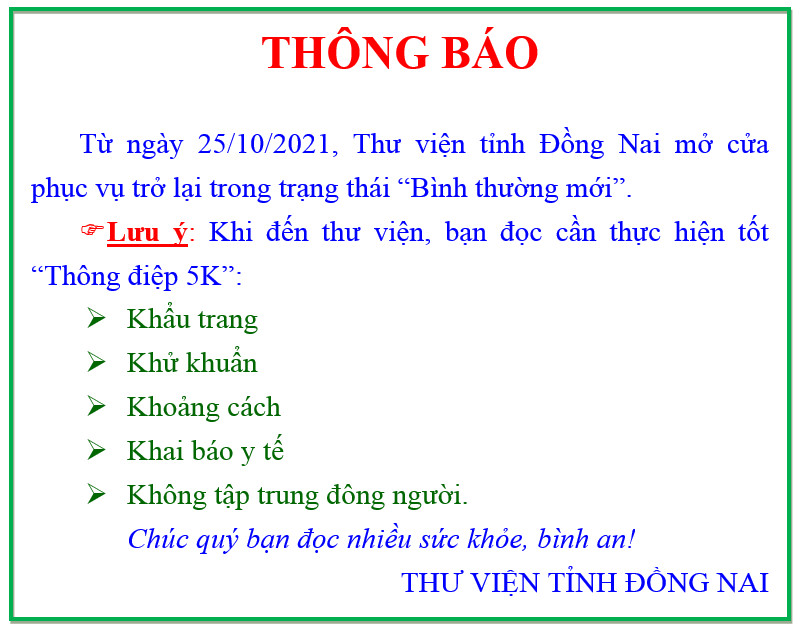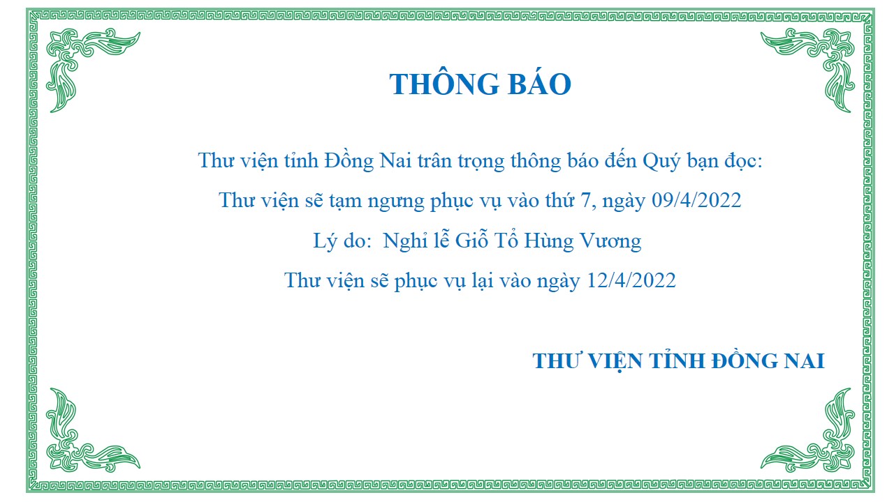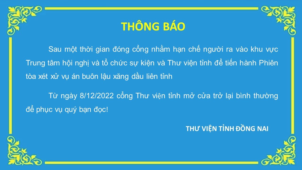Thông báo về việc tạm ngưng phục vụ bạn đọc tại Thư viện tỉnh Đồng Nai, phường Tân Triều