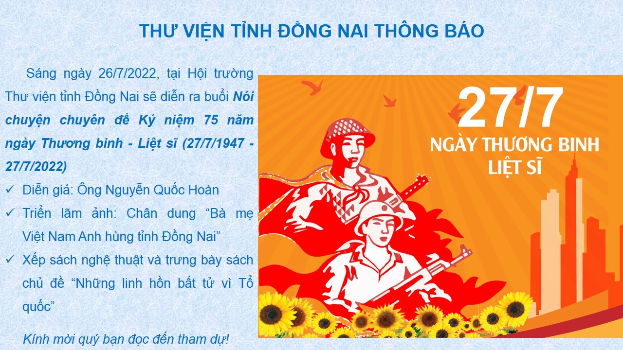 Thực hiện kế hoạch tổ chức trưng bày, triển lãm những ngày lễ kỷ niệm trong năm. Phòng phục vụ bạn đọc Thư viện tỉnh Đồng Nai đã trưng bày và xếp sách nghệ thuật với chủ đề “Quyết tử để tổ quốc quyết sinh” nhân kỷ niệm 75 năm ngày Bác Hồ ra lời kêu gọi Toàn quốc kháng chiến (19/12/1946 – 19/12/2021), 77 năm ngày thành lập Quân đội nhân dân ...