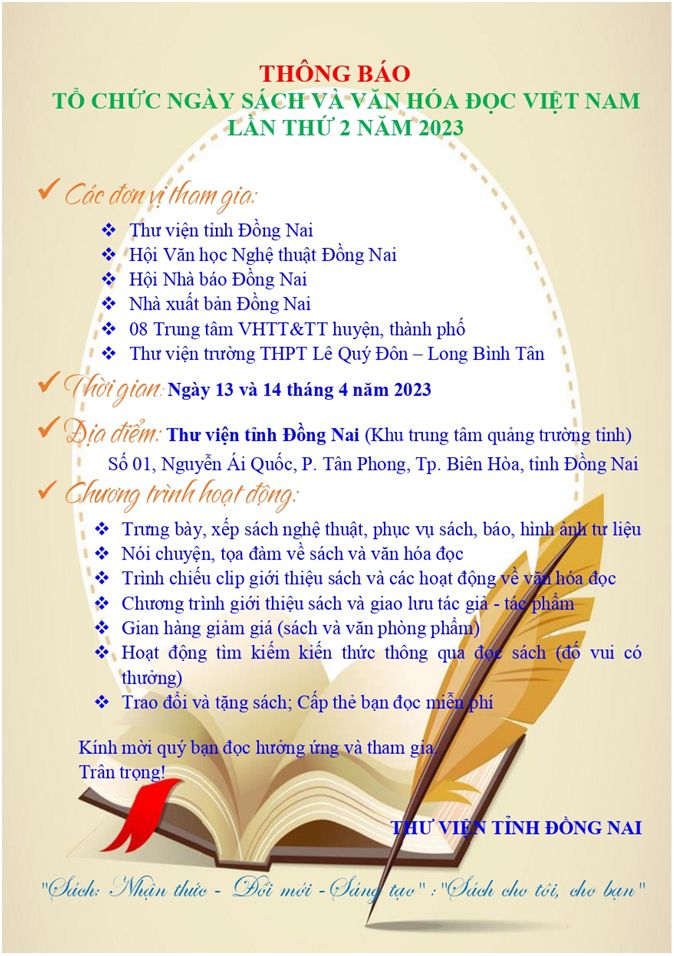Hưởng ứng Ngày Sách và Văn hóa đọc Việt Nam lần thứ 8, đồng thời chào mừng kỷ niệm các ngày lễ của địa phương, của đất nước như: Ngày Giải phóng Long Khánh 21/4; Ngày Giải phóng miền Nam thống nhất đất nước và Ngày Giỗ tổ Hùng Vương 10/3 Âm lịch, ngày 17-4, tại Công viên Vườn Dầu Tp. Long Khánh, Thư viện Đồng Nai phối hợp với Trung tâm Văn hóa ...