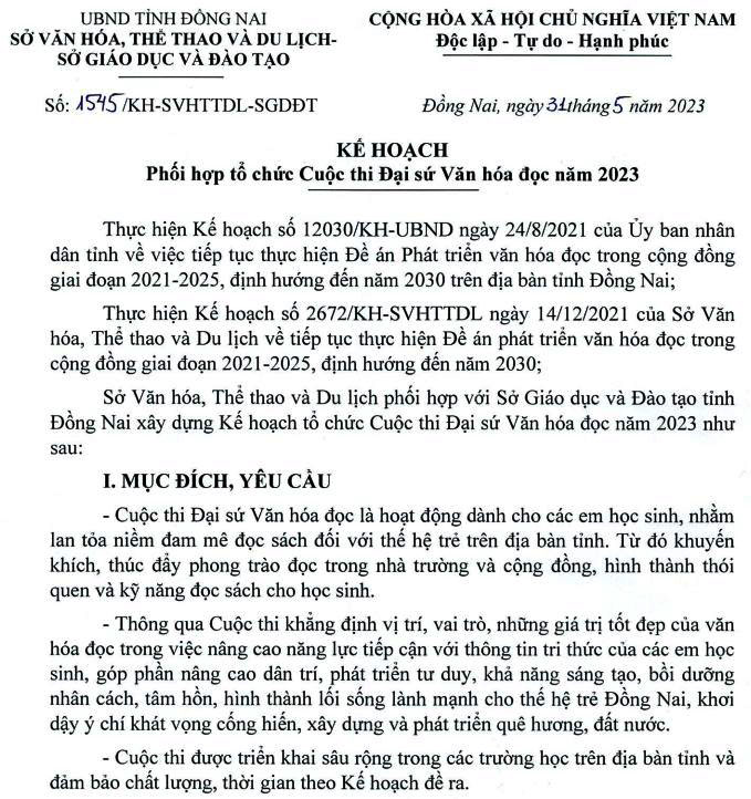1. Kế hoạch phối hợp tổ chức Cuộc thi Đại sứ Văn hóa đọc năm 2025 2. Thể lệ cuộc thi Đại sứ Văn hóa đọc năm 2025 3. Mẫu đăng ký dự thi ĐSVHĐ 2025